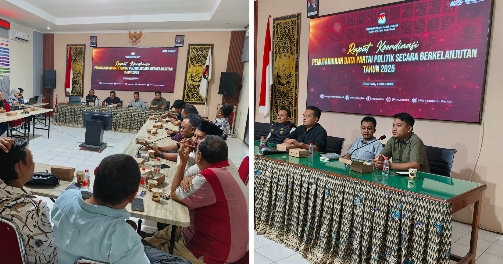 Pacitan, 4 Juli 2025 – Ketua Bawaslu Kabupaten Pacitan, Syamsul Arifin, dan Koordinator Divisi Hukum dan Penyelesaian Sengketa, Muhammad Nur, menghadiri Rapat Koordinasi Pemutakhiran Data Partai Politik Secara Berkelanjutan Tahun 2025 yang diselenggarakan oleh Komisi Pemilihan Umum (KPU) Kabupaten Pacitan di Kantor KPU setempat.