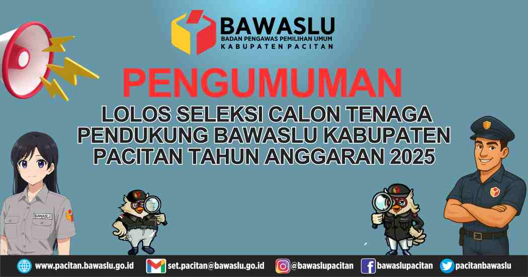 Nama – nama yang dinyatakan Lolos Seleksi selanjutnya menyiapkan Surat Keterangan Sehat Rohani dan Surat Keterangan Bebas dari Penyalah Gunaan Narkotika dan untuk hadir di Kantor Bawaslu Kabupaten Pacitan Tanggal 25 September 2025 Pukul 09.00 Wib dengan Pakaian Batik dan Bersepatu.